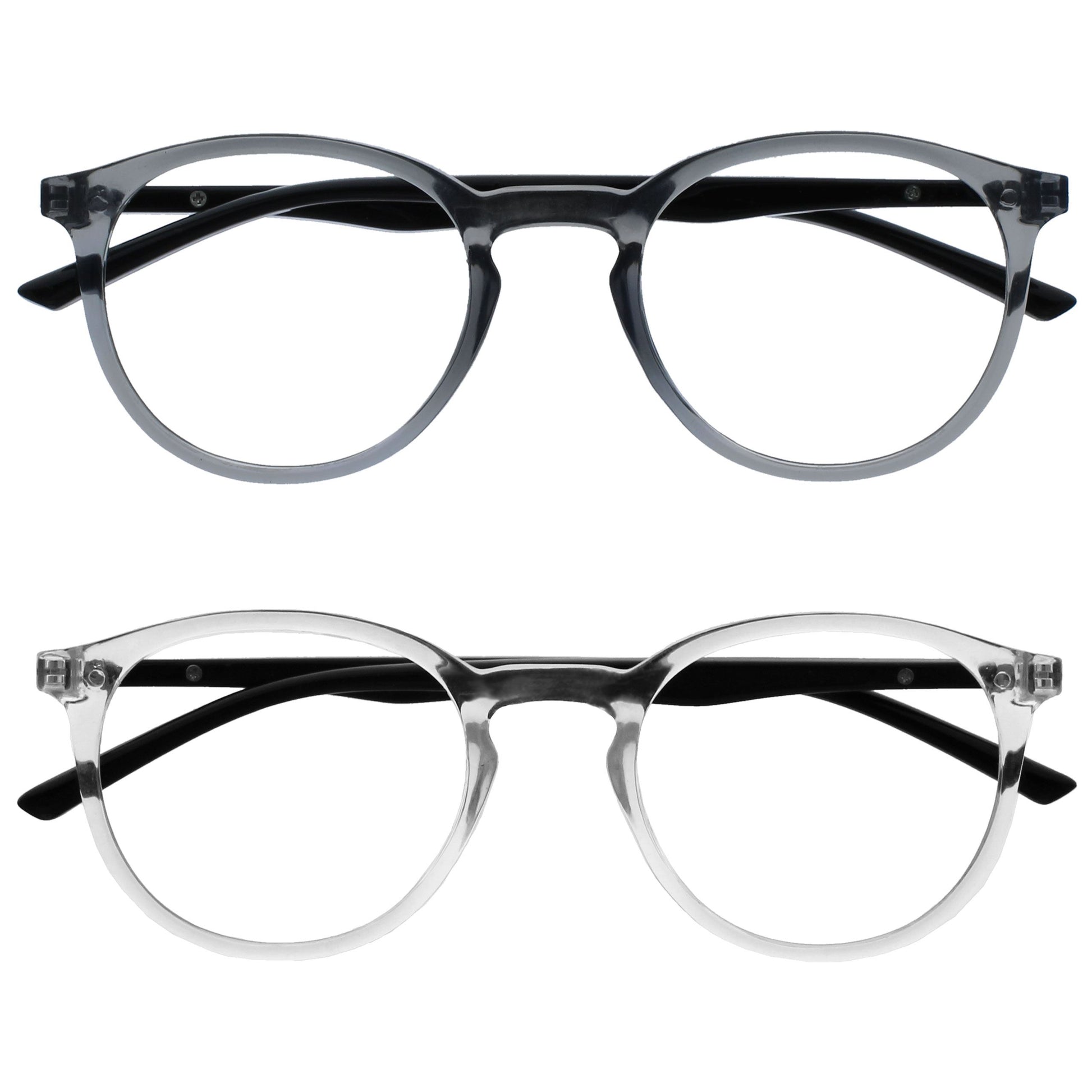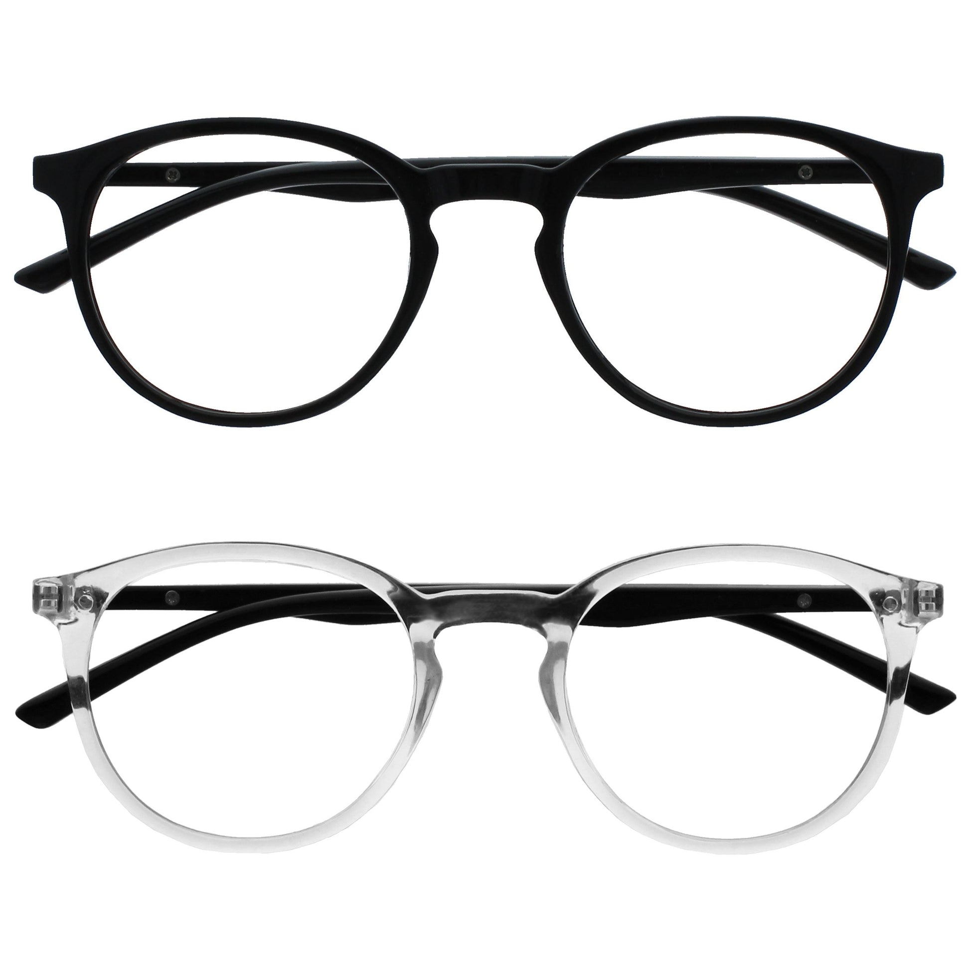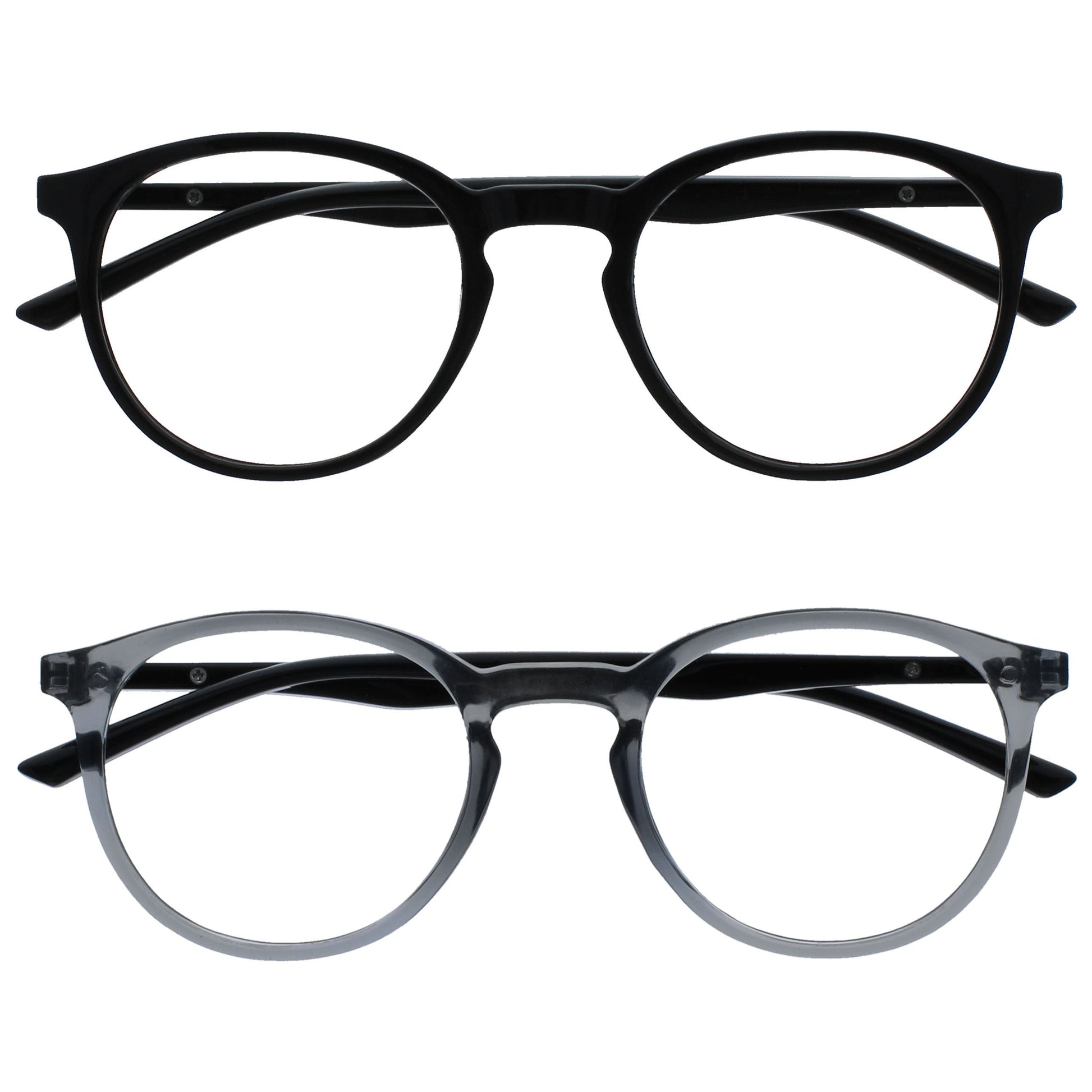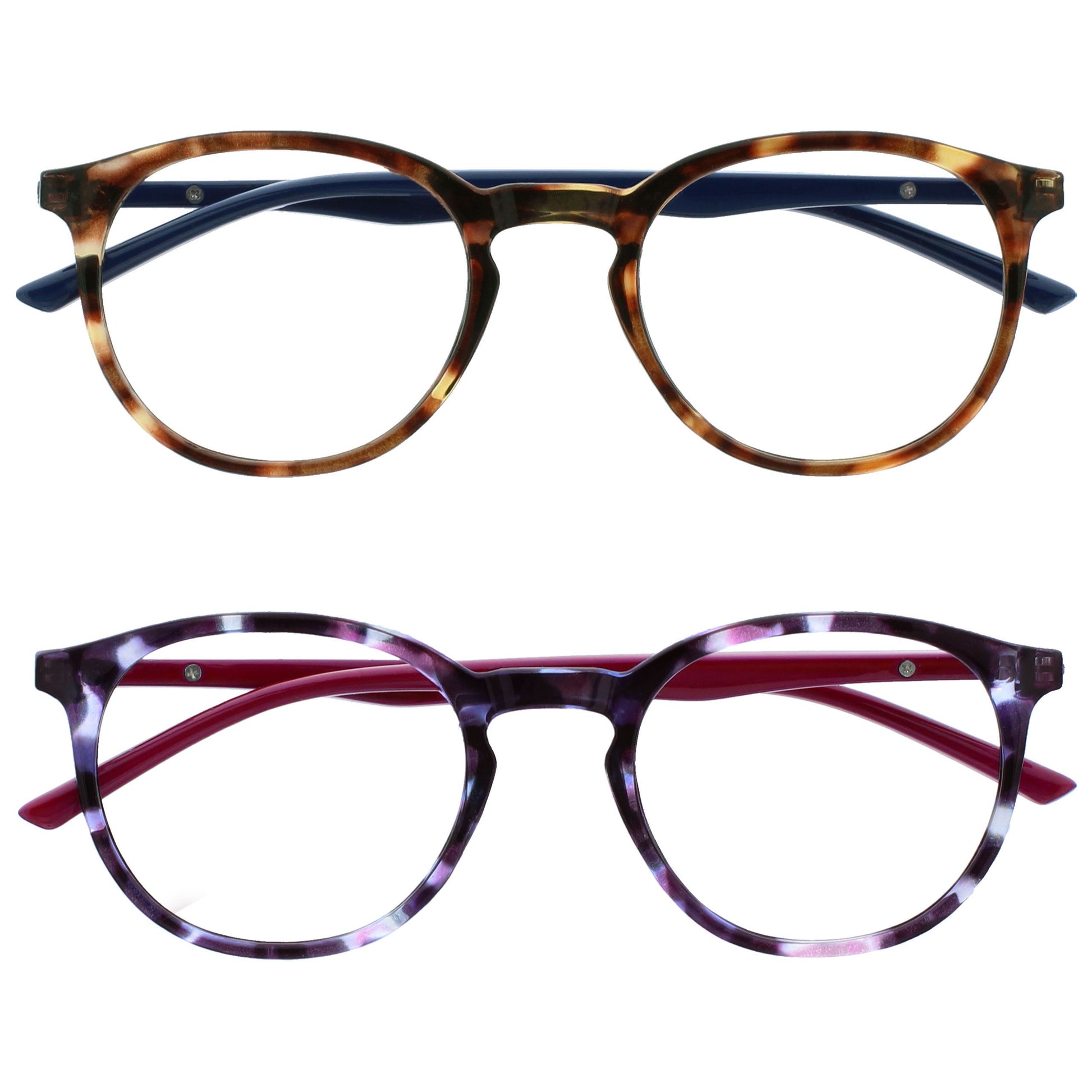 Reading and Blue Light Glasses in this popular stylish thin round frame, in 6 sophisticated colours. Finished with a contrast arm and elegant metal detail. This value 2 pack with scratch-resistant lenses and spring hinges for extra comfort. Unisex. Felt pouches included. Fashion Glasses also available in Zero strength.