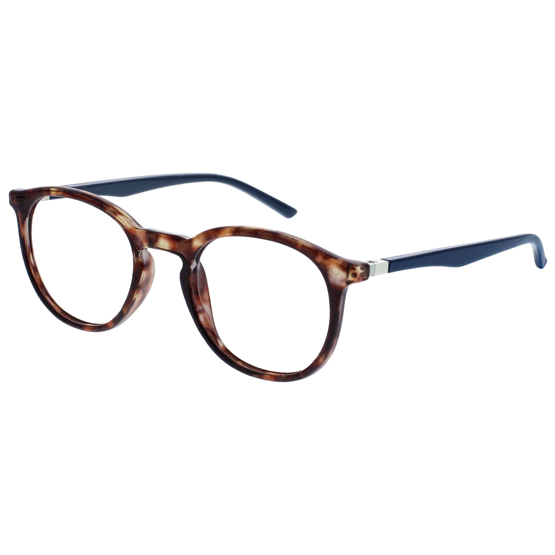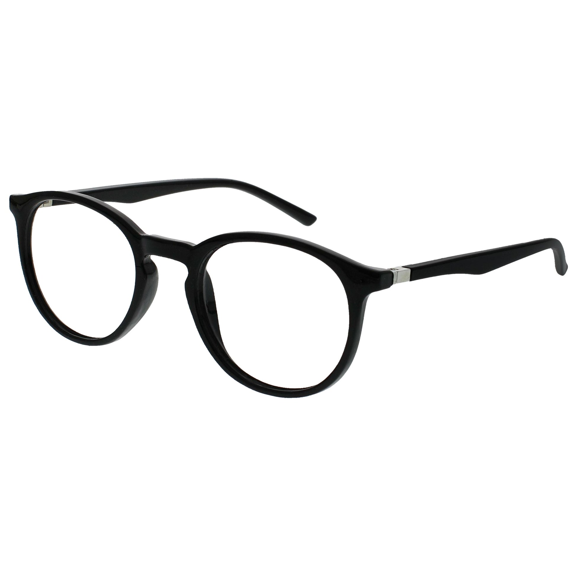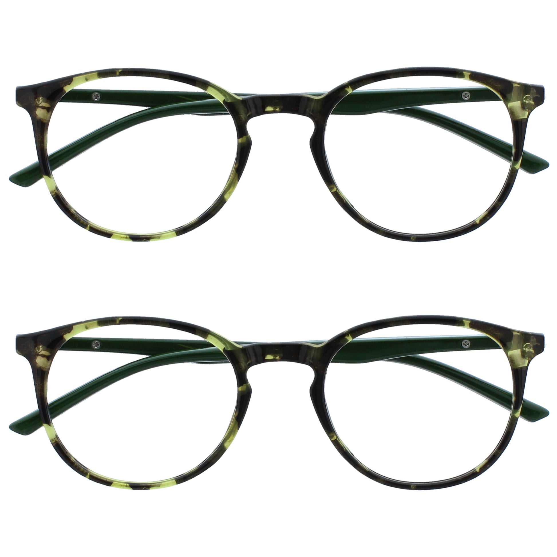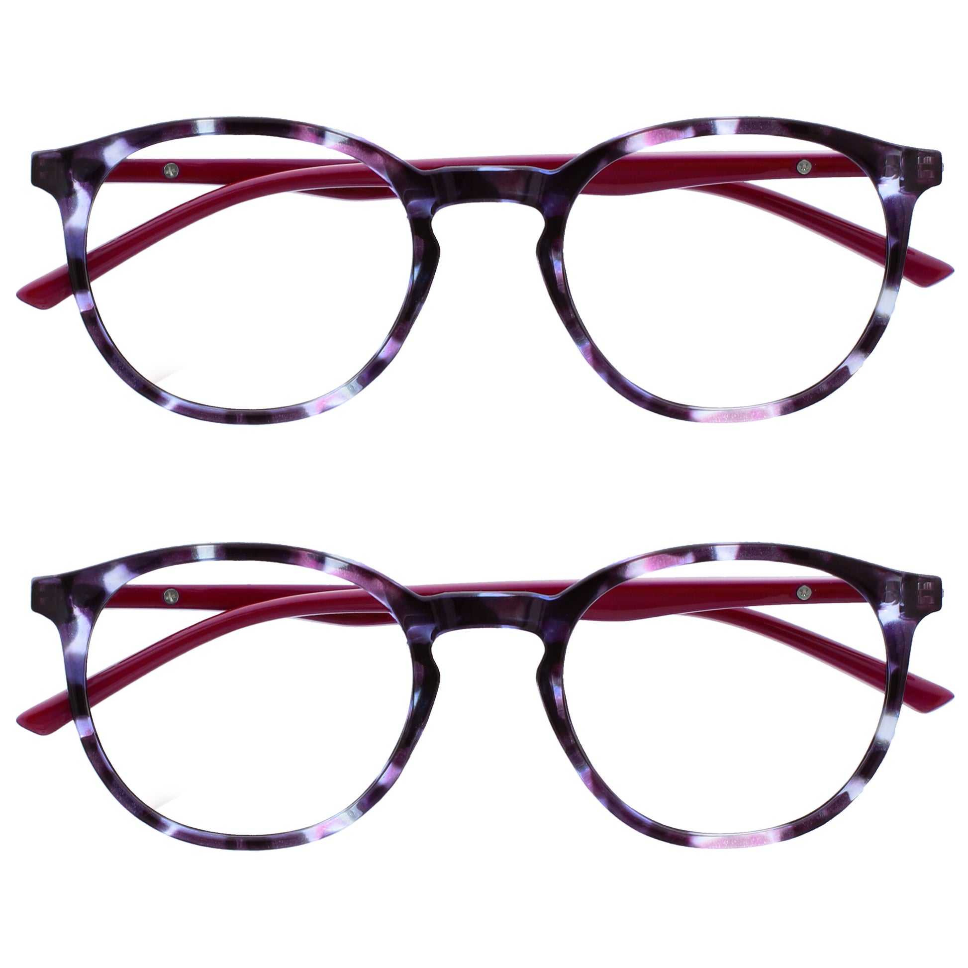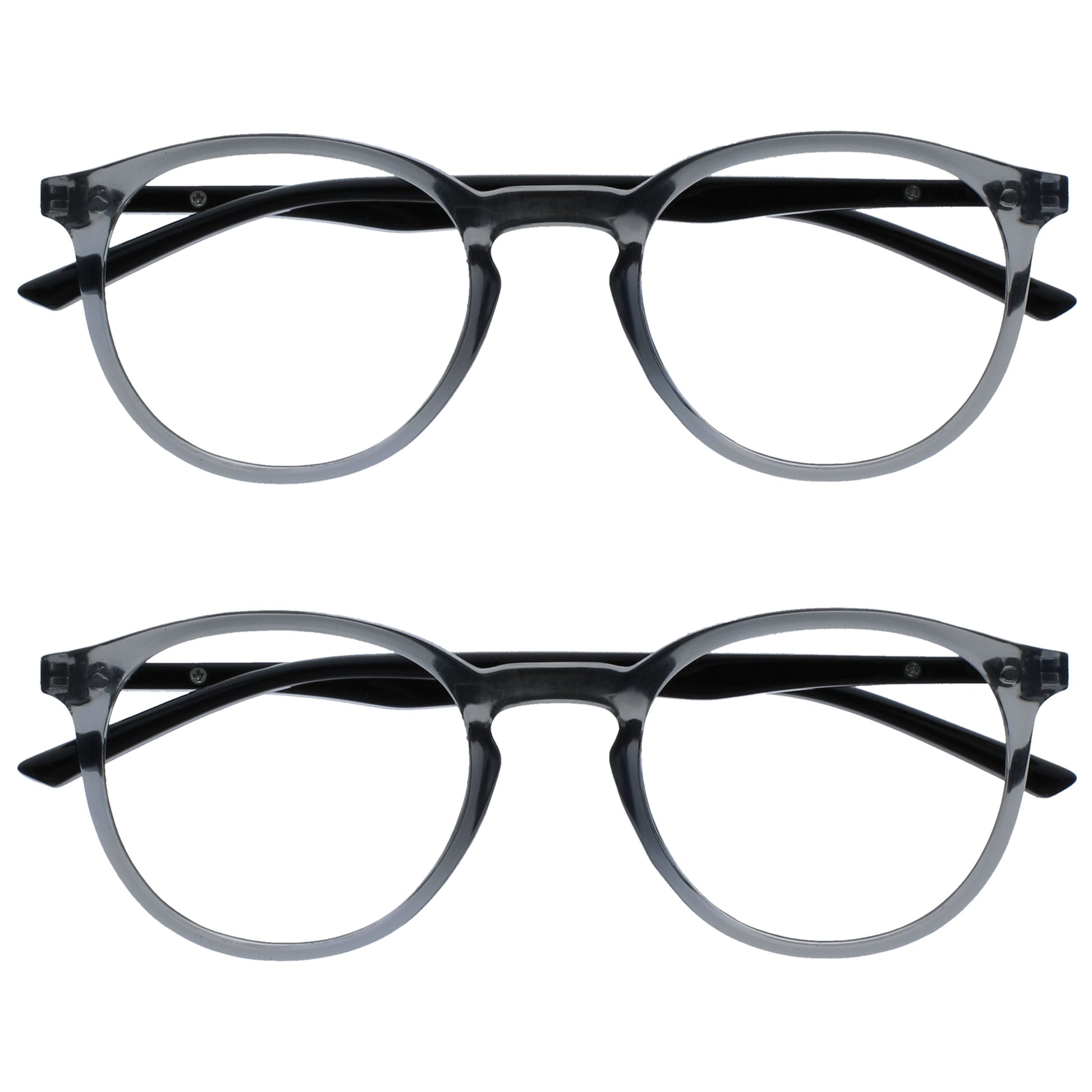 Reading and Blue Light Glasses in this popular stylish thin round frame, in 6 sophisticated colours. Finished with a contrast arm and elegant metal detail. This value 2 pack with scratch-resistant lenses and spring hinges for extra comfort. Unisex. Felt pouches included. Fashion Glasses also available in Zero strength.