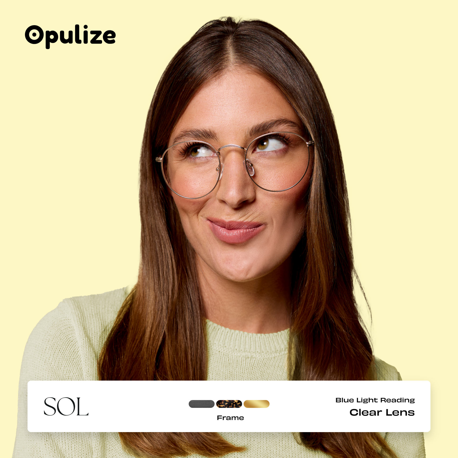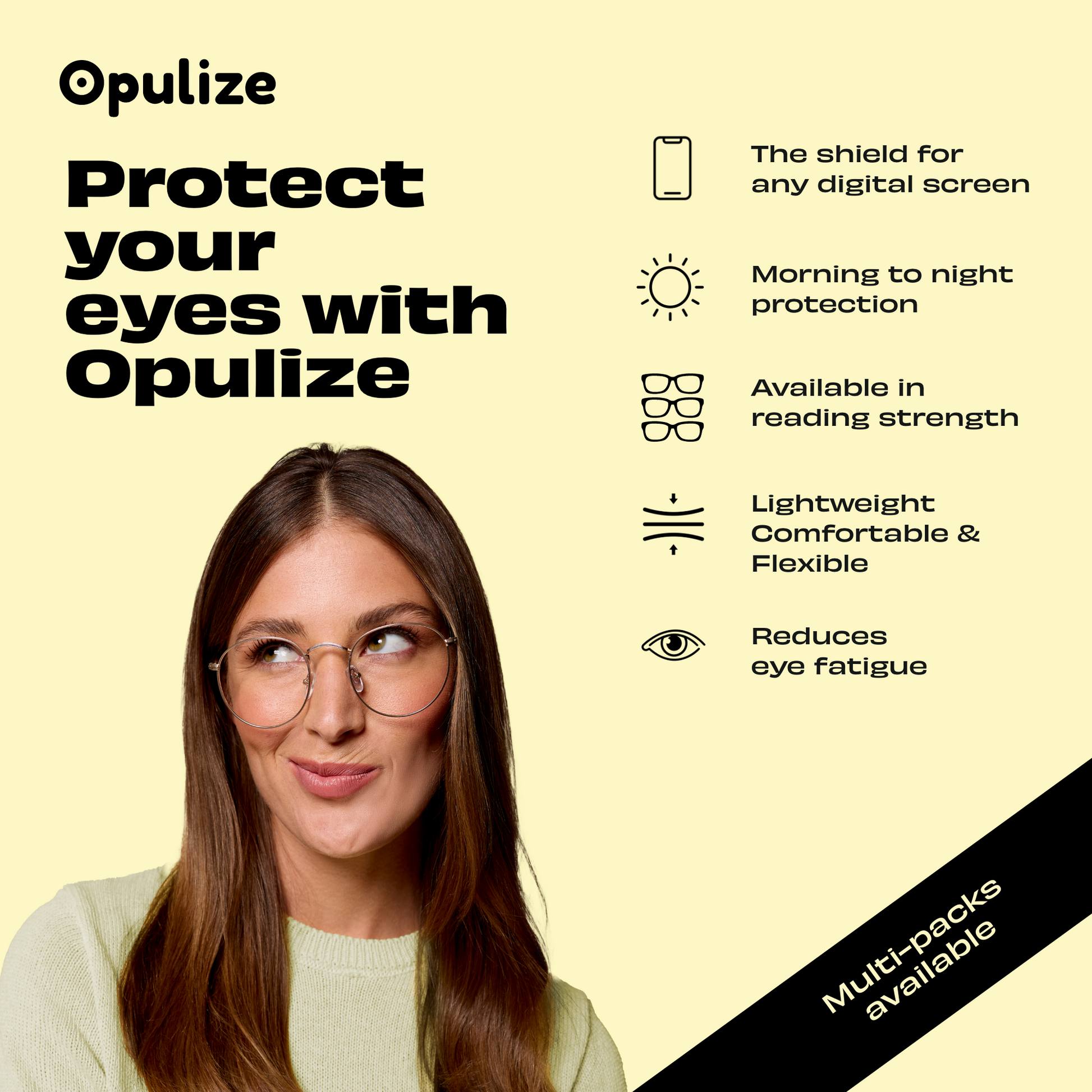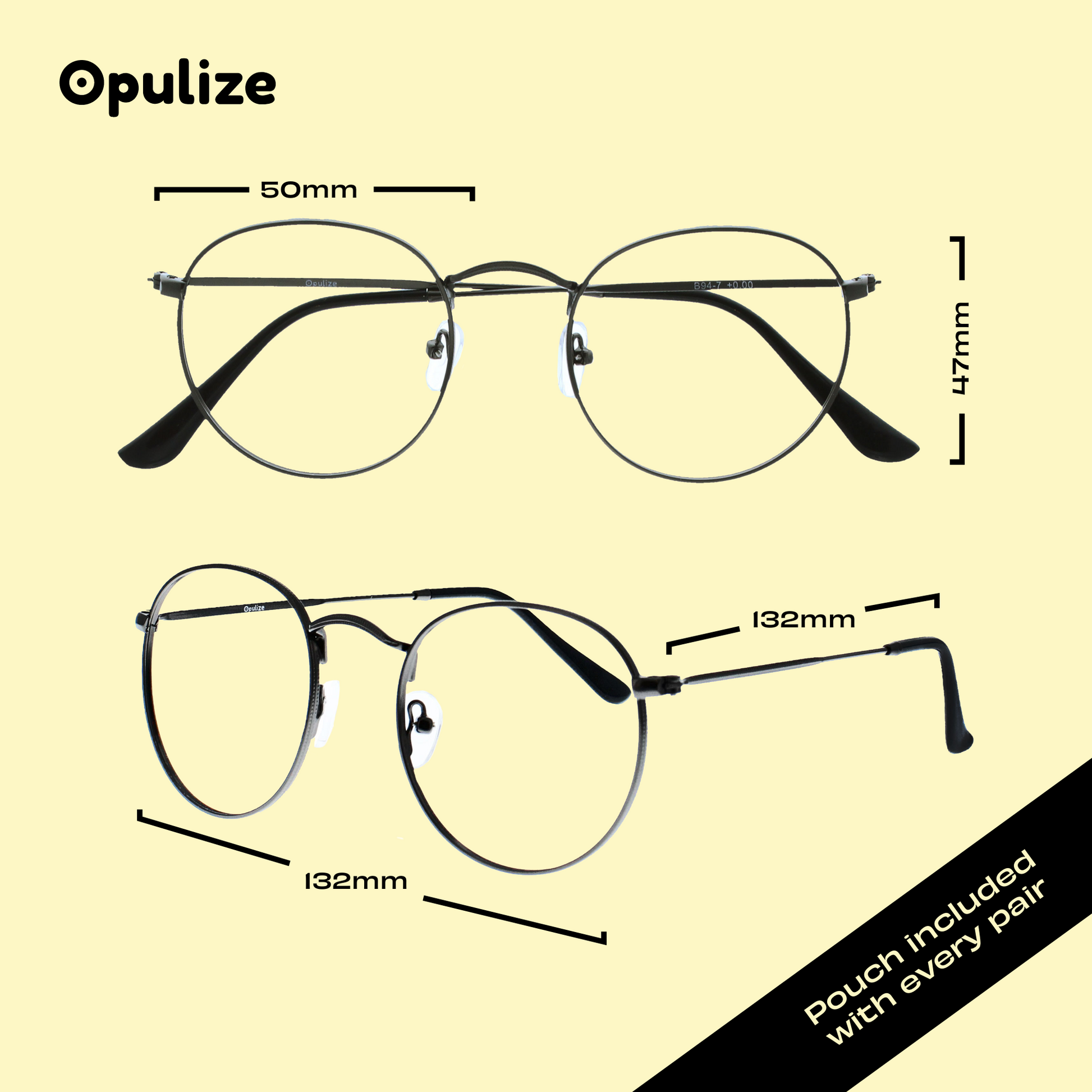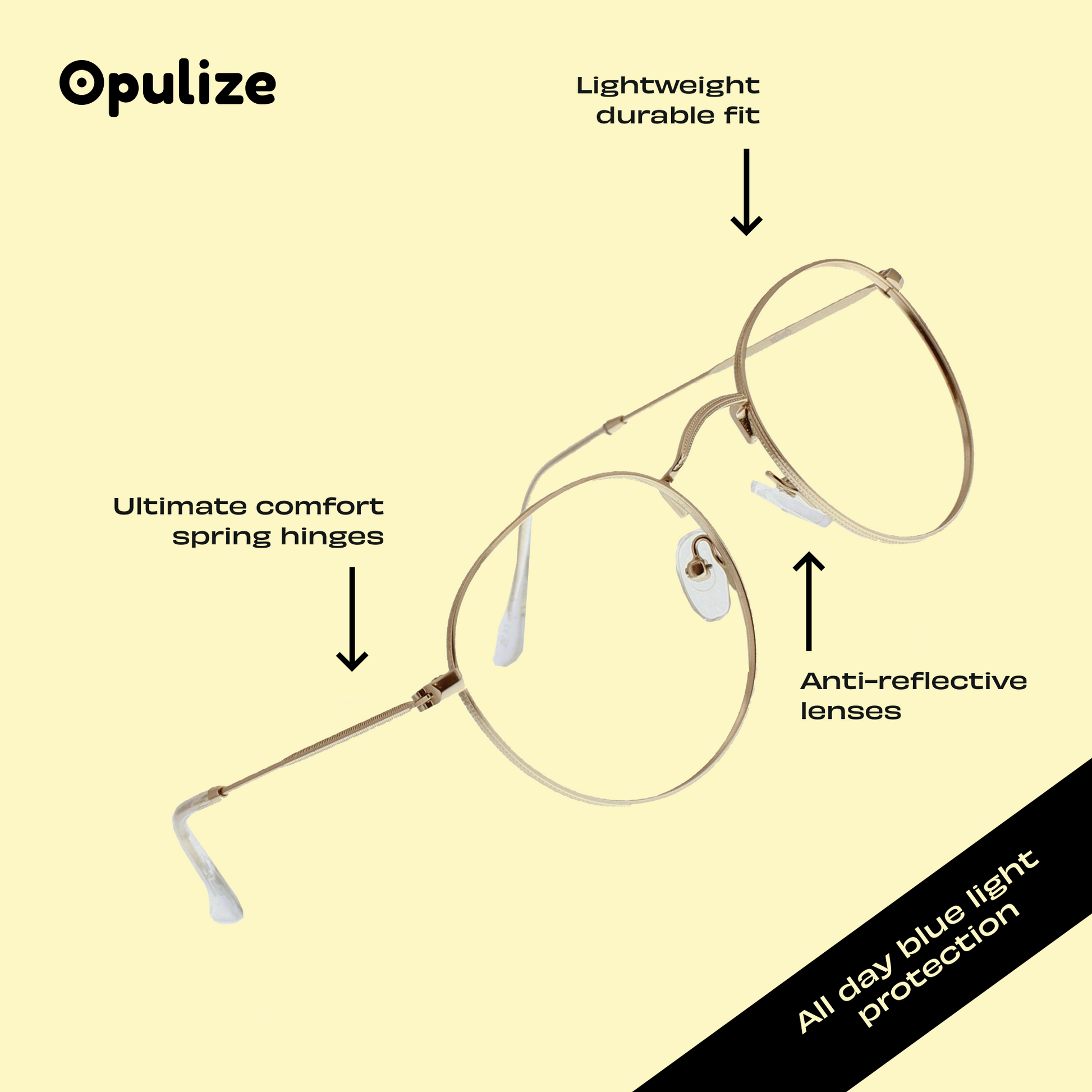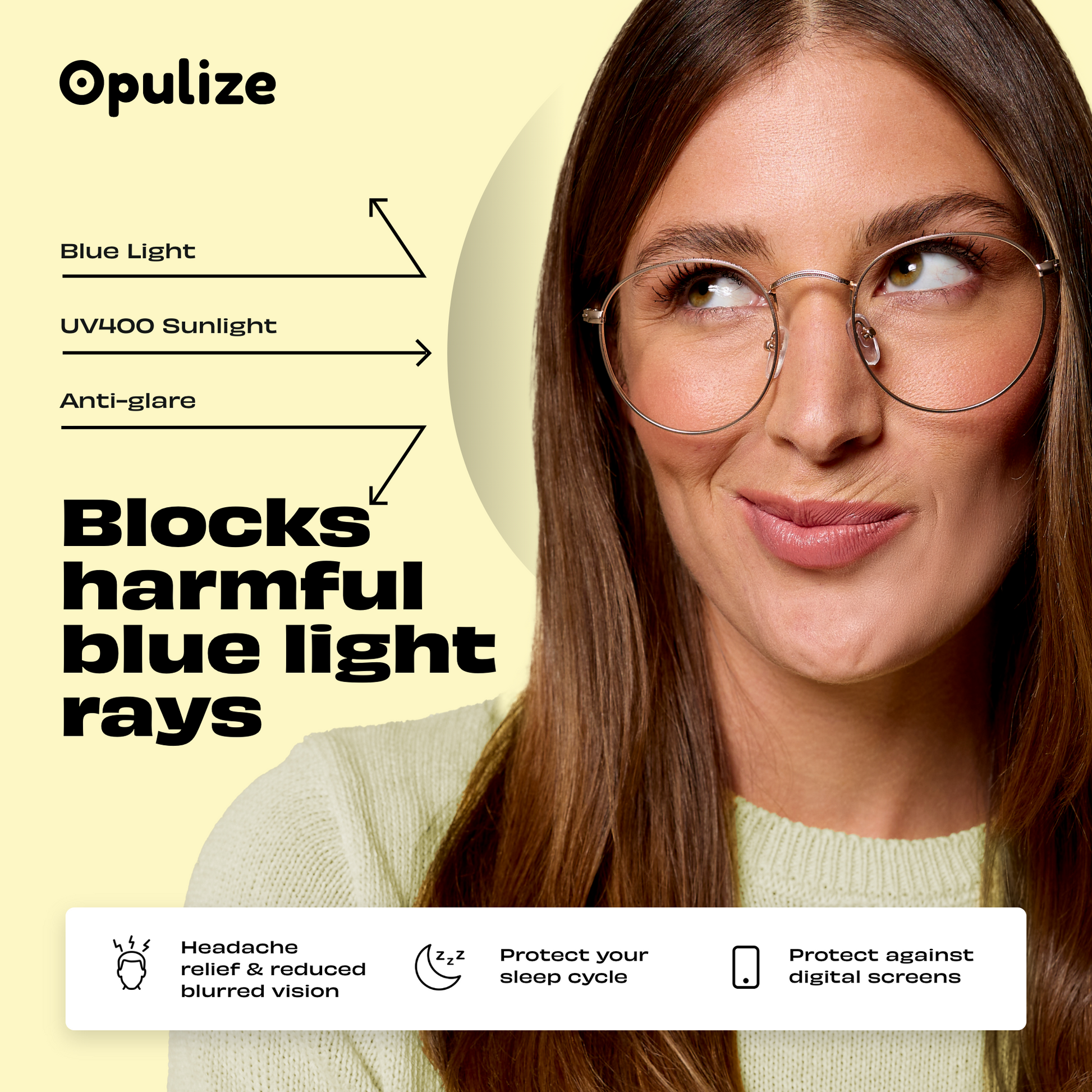 Opulize Zero Strength Blue Light Glasses. Our clear lenses with no magnification and blue light filtering means you can filter harmful light rays when looking at screens all day. These iconic lightweight wire frames inspired by 1960's music culture, makes these distinct round retro shape glasses a design classic. Opulize felt pouch included.
